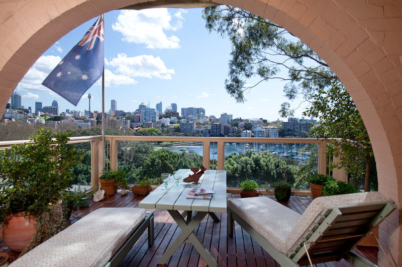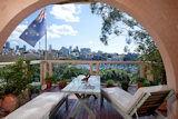 Overlooking picturesque harbour, city skyline and boat-filled bay.